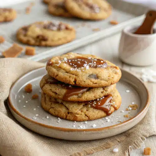 That is exactly how this batch of salted caramel cookies came to life in my kitchen. I brewed a fresh pot of coffee, tied on my favorite apron, and got to work. What came out of the oven honestly blew my mind. These aren’t just cookies; they are a whole experience. The way the warm, melted caramel pulls apart when you break one in half, followed by that delicate crunch of flaky sea salt… it is pure magic. I knew immediately I had to share this with you. Grab your favorite mug, get comfortable, and let’s talk about your new baking obsession.