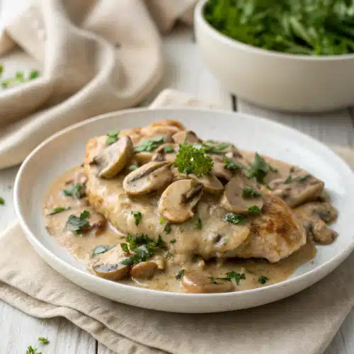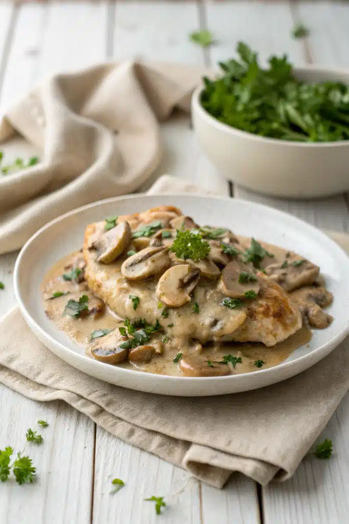 It’s a gorgeous, bubbling reduction of butter, deeply browned mushrooms, minced garlic, savory chicken broth, and heavy cream. We usually finish it off with a handful of parmesan cheese and some fresh herbs to brighten it up. The earthy flavor of the mushrooms infuses right into the cream as it simmers, creating a velvety gravy that coats the chicken perfectly. While a lot of traditional recipes keep it strictly on the stovetop, I actually love giving the chicken a quick sear and letting it finish baking right in that glorious sauce so it stays unbelievably juicy. It’s essentially a one-pan wonder that bridges the gap between a cozy, lazy weeknight dinner and a show-stopping meal you’d proudly serve to your fanciest dinner guests.