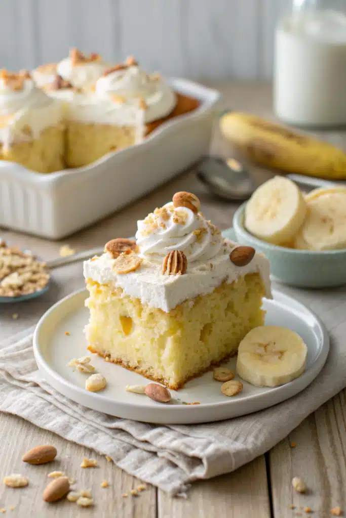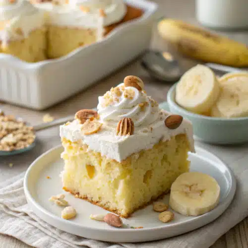 In this specific recipe, we are baking a simple, buttery yellow cake and drenching it in a rich, creamy banana pudding mixture. As the cake chills in the fridge, it absorbs all that glorious pudding, creating a dessert that sits perfectly halfway between a traditional cake and a custard. We then top it off with a thick cloud of whipped cream, freshly sliced bananas, and a generous sprinkle of crushed vanilla wafers. It is the ultimate mashup dessert. You get the sturdy structure of a cake with the gooey, melt-in-your-mouth texture of a pudding. Every single bite is packed with that iconic banana flavor we all know and love.