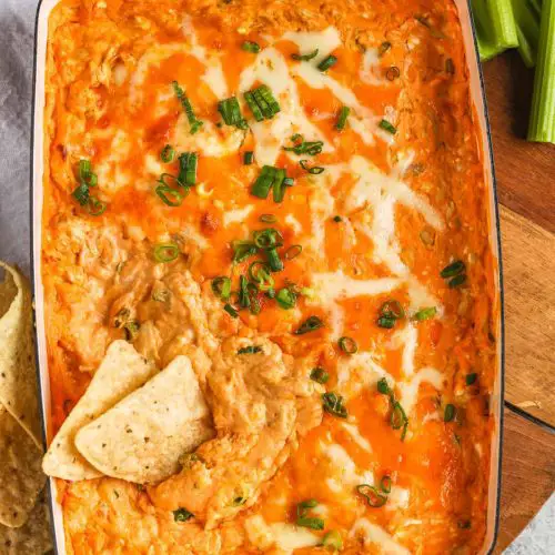 Once it’s out of the oven, let the Buffalo Chicken Dip cool for about 5-10 minutes before serving. This is important! It’s incredibly hot right out of the oven, and letting it sit allows it to set up slightly, making it easier to scoop and preventing you from burning your tongue (guilty of that more times than I care to admit!).