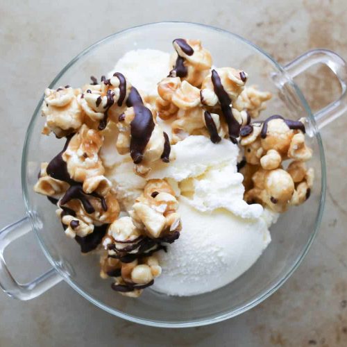 - Top the ice cream with the chocolate-drizzled caramel popcorn.