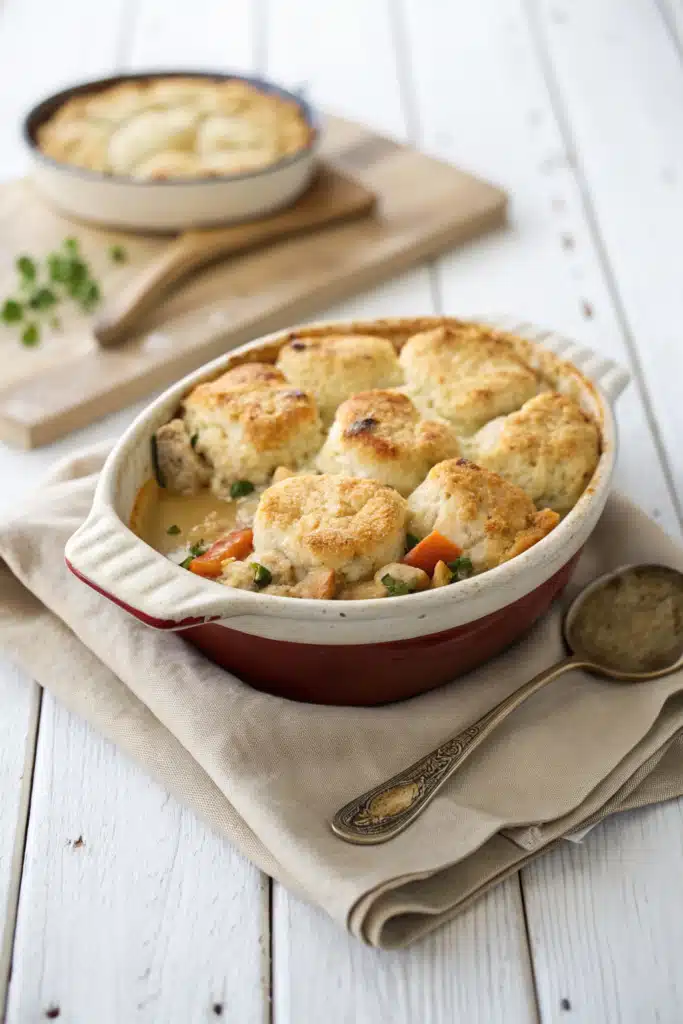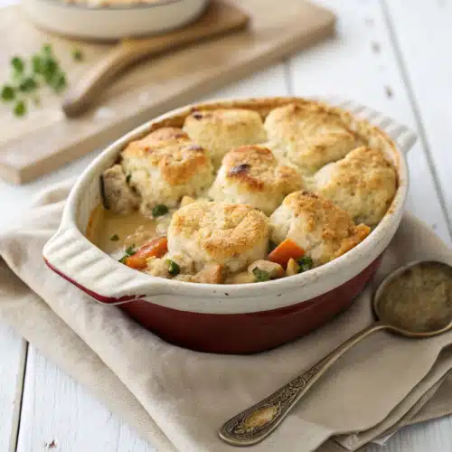 I remember the first time I set this down on the dinner table; my husband looked a little confused. “Is it pot pie?” he asked, trying to peek under the crust. “Sort of, but better,” I replied. After one single bite, everyone was completely hooked. It has all the cozy, savory flavors of a traditional chicken pot pie, but with a buttery, biscuit-like crust that bakes right into the rich filling. The absolute best part? It takes a fraction of the effort. No rolling out pie dough or spending hours hovering over a hot stove. You basically just layer the ingredients, pop it in the oven, and let the magic happen. Grab a cup of coffee, and let’s walk through how to make your new favorite weeknight dinner.