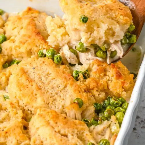 So, what exactly is a chicken and dumplings casserole? Think of it as the brilliant lovechild between traditional stovetop chicken and dumplings and a classic baked chicken pot pie. Instead of simmering everything in a heavy Dutch oven for hours, we create a quick, deeply flavorful savory sauce right in a skillet, fold in some shredded chicken and peas, and then transfer the whole glorious mixture into a 9×13 baking dish.