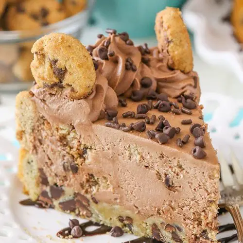 - Remove the cheesecake from the springform pan and pipe swirls of whipped cream around the edge. Top the cheesecake with additional cookies and mini chocolate chips. Refrigerate cheesecake until ready to serve. Cheesecake is best for 3-4 days.