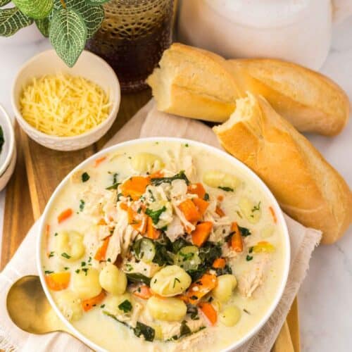 Want to freeze it? You absolutely can, but with one important catch: freeze the soup base before you add the gnocchi, heavy cream, and spinach. Dairy and potato dumplings do not fare too well in the freezer and can become grainy or mushy. When you are ready to eat, thaw the base, heat it up in the crockpot or on the stove, and add your fresh gnocchi, cream, and greens right at the end!