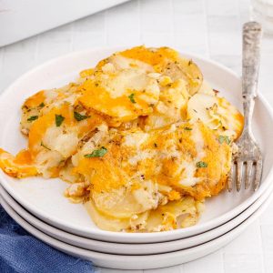 If you want a little extra cheesy punch, sprinkle some of the cheese mixture over the layered potatoes here. For a flavor boost, toss in a couple of fresh herbs or a pinch of chili flakes if you like heat.