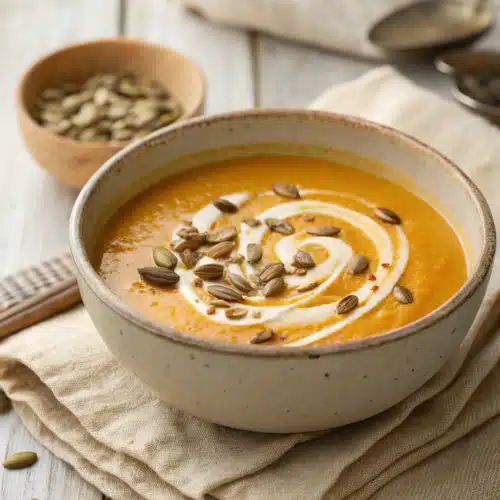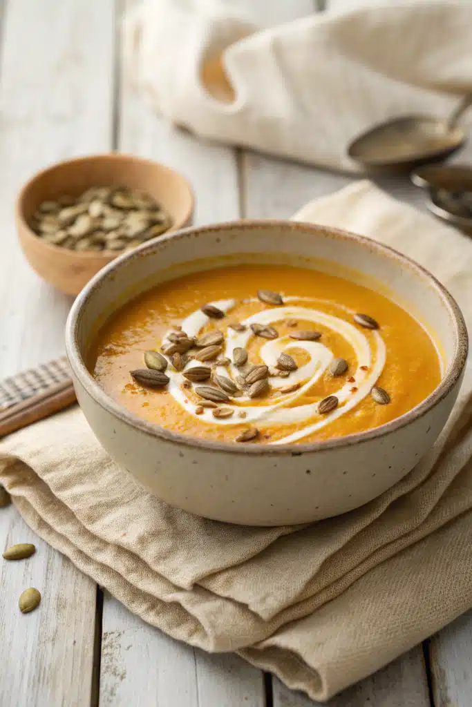 If you want to keep things on the lighter side, serve it alongside a crisp autumn salad loaded with mixed greens, sliced apples, candied pecans, and a tangy apple cider vinaigrette. For toppings, I love to garnish the soup with roasted pumpkin seeds (pepitas), a swirl of cream, or even some crispy bacon bits for a salty, savory crunch.