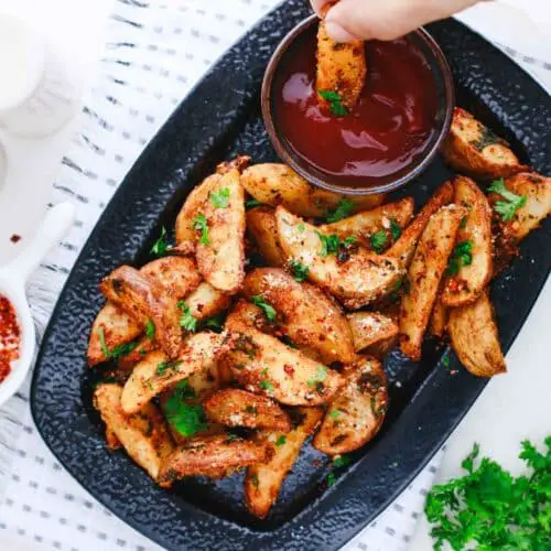These air fryer potato wedges are incredibly versatile and play well with almost anything. If you’re hosting a game-day party, pile them high on a platter with a fun selection of dipping sauces. You can’t go wrong with classic ketchup, but I highly recommend trying them with a tangy chipotle mayo, creamy garlic ranch, or a sweet honey mustard dip.
