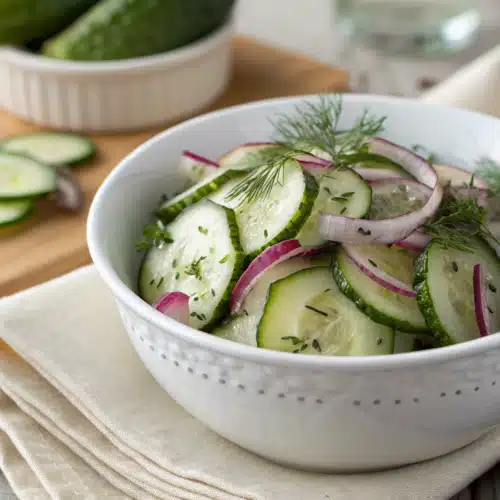 It is the kind of recipe that instantly transports me back to my grandmother’s kitchen, where a big glass bowl of these marinated cucumbers was a staple at every single family barbecue. There is just something magical about how a few humble ingredients can transform into a dish that everyone fights over. Whether you are hosting a massive backyard cookout or just need a quick veggie side for your Tuesday night chicken dinner, this easy cucumber salad is about to become your new best friend. It takes practically zero effort, uses ingredients you probably already have sitting in your pantry, and tastes better the longer it sits. Let’s dive into why this simple classic deserves a permanent spot in your recipe rotation.