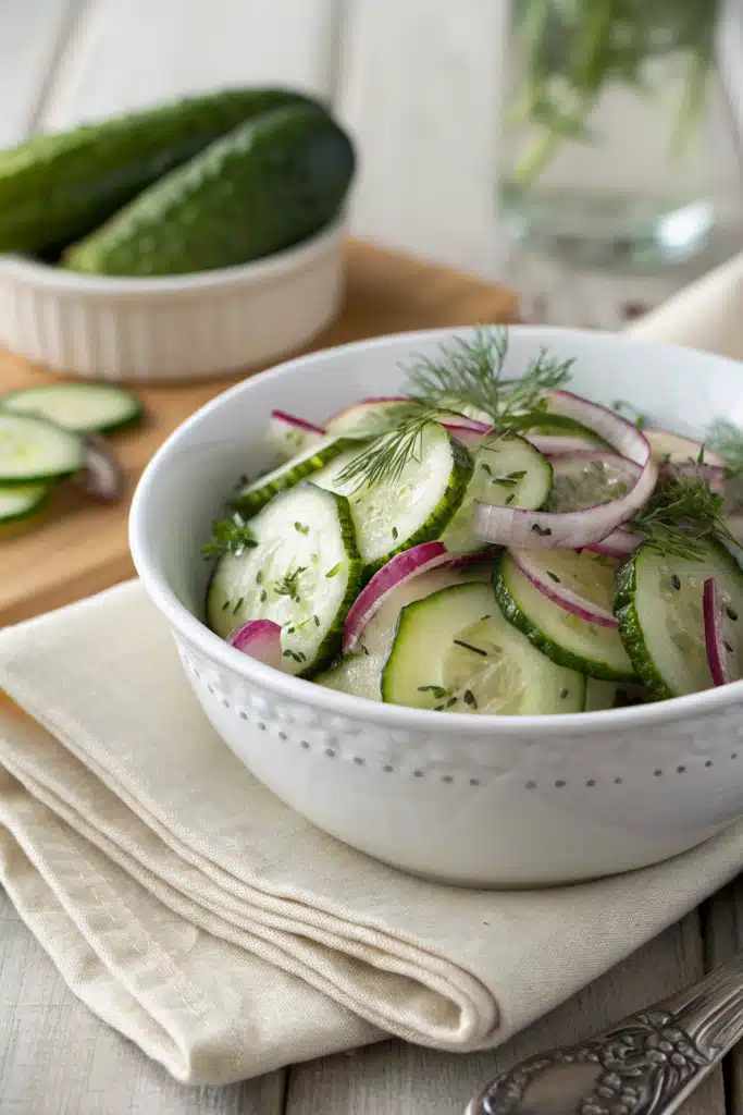 - Salting the cucumbers first: If you want an extra crunchy salad that doesn’t get watery the next day, toss your cucumber slices in a colander with a teaspoon of salt. Let them sit in the sink for 30 minutes to drain excess water, then squeeze them gently before adding the dressing.