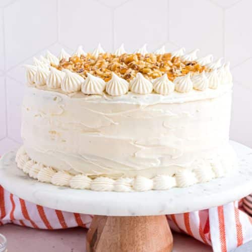 - Remove the cake from the refrigerator and apply the remaining frosting, decorating with a piping bag and tip if desired. Sprinkle the chopped pecans over the top of the cake and drizzle with caramel sauce.