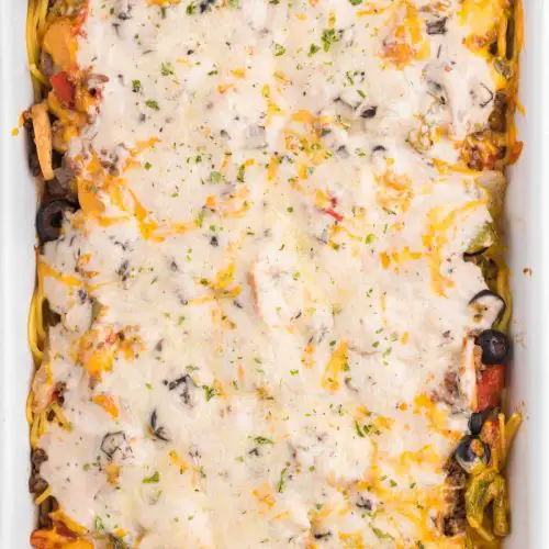 Pour about half of the spaghetti mixture into your prepared baking dish and spread it out evenly. Sprinkle about half of the shredded mozzarella cheese over this layer. Then, spoon the remaining spaghetti mixture on top and spread it out. Finally, sprinkle the rest of the mozzarella cheese evenly over the top, making sure to get it all the way to the edges. You can also add a little extra sprinkle of Parmesan cheese on top if you’re feeling extra cheesy!