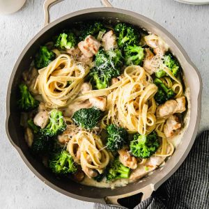 - Finally, add the chicken and broccoli to the skillet and fold the chicken and vegetables into the pasta and sauce.
