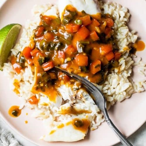 Carefully nestle the chunks of fish into the simmering sauce. Make sure they’re mostly submerged. Cover the pan with a lid and let the fish poach in the sauce for about 5-8 minutes, depending on the thickness of your fillets. You’ll know it’s done when the fish is opaque and flakes easily with a fork.