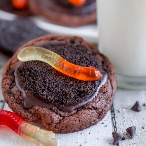 - Spoon the glaze onto each cookie, then top with crushed Oreos and a gummy worm. Let cool before serving.