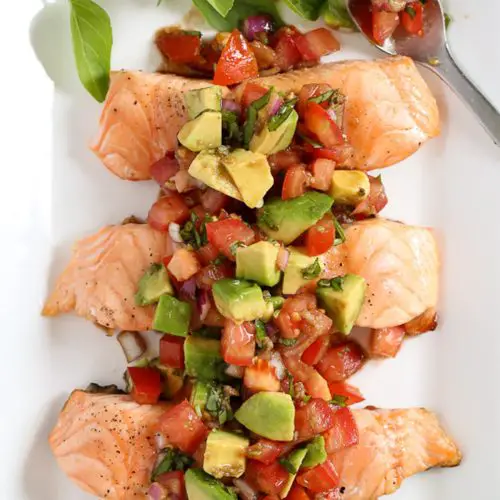 - Top each salmon fillet with 0.5 cup of prepared avocado bruschetta and serve.
