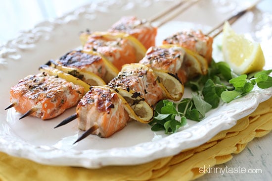 - Beginning and ending with salmon, thread salmon and folded lemon slices onto 8 pairs of parallel skewers to make 8 kebabs total.