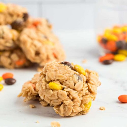 - Add vanilla, salt, and peanut butter. Stir until smooth. Fold in oats, stirring until completely combined. Fold in candy.