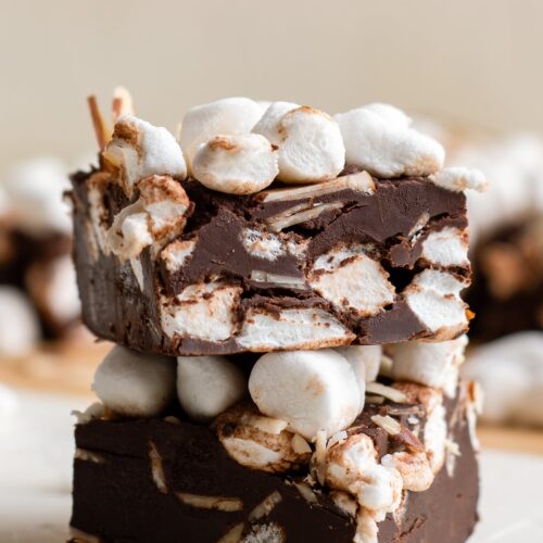 Because this Rocky Road Fudge is wonderfully rich and decadent, it pairs beautifully with things that balance out its sweetness. I absolutely love serving a plate of these fudge squares alongside a piping hot cup of black coffee or a strong espresso; the bitterness of the coffee cuts right through the sweet chocolate and marshmallows.