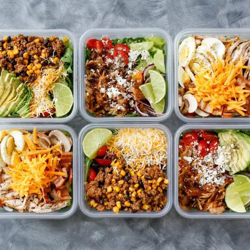 - Divide chopped vegetables among four containers, top with corn, avocado, cheese, and half the onions. Place a paper towel in each container to absorb moisture and extend freshness.