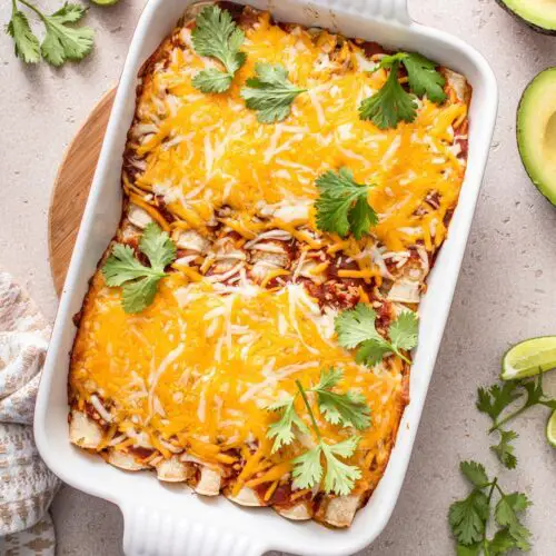 Want to freeze them? You absolutely can! Just assemble the uncooked enchiladas in a freezer-safe, disposable foil pan. Do not bake them yet! You can freeze them just like this for up to three months. When you are ready for an easy dinner, you can thaw them overnight in the fridge and bake as directed, or bake them straight from frozen by covering them with foil and baking for 30 minutes, then removing the foil for another 15 minutes until bubbly.