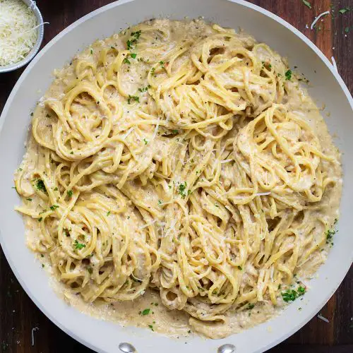 - Add the cooked pasta to the skillet and toss until the noodles are evenly coated with the creamy sauce. If the sauce is too thick, add more reserved pasta water to reach desired consistency.