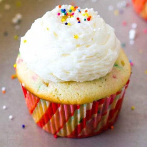 - Once the cupcakes are completely cool, frost them with the vanilla buttercream. Decorate with extra sprinkles if desired.