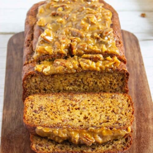 If you’re hosting an autumn brunch, cut the loaf into smaller, bite-sized pieces and add it to a seasonal spread next to some apple cider donuts, a fresh fruit salad, and maybe a savory quiche. Want to turn this into a decadent dessert? Pop a slice in the microwave for ten seconds, place it in a bowl, and top it with a generous scoop of vanilla bean or cinnamon ice cream. Add a little extra drizzle of caramel and a few more chopped pecans, and you’ve got a restaurant-quality dessert right in your own kitchen!