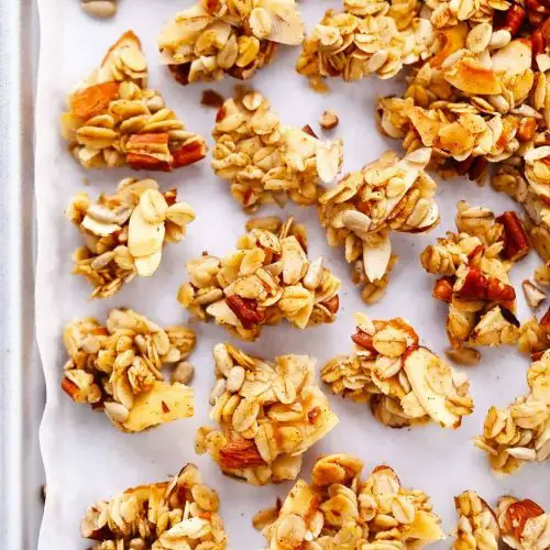 - Bake for 20-25 minutes, stirring halfway through, until golden brown and fragrant. For clusters, avoid stirring too much in the last 10 minutes. Let it cool completely on the baking sheet to form clusters.