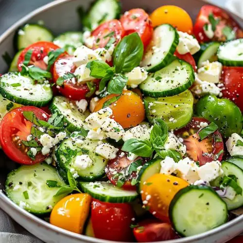 In just a few minutes, you’ll chop a few fresh veggies, crumble some feta, whisk a bright dressing, and toss everything together. The beauty is in the texture contrast and the way the flavors bloom after a short rest. You don’t need any cooking here—just a trusty knife, a board, a bowl, and good olive oil. The result is crisp, zippy, and utterly satisfying. This method keeps things simple: high-quality produce, minimal fuss, maximum flavor. If you’re feeding a crowd or a weeknight family dinner, you’ll be amazed at how little effort yields so much sunshine on a plate. Greek Cucumber Tomato Salad is the kind of recipe that tastes like a warm hug in a bowl—the kind you’ll reach for again and again.