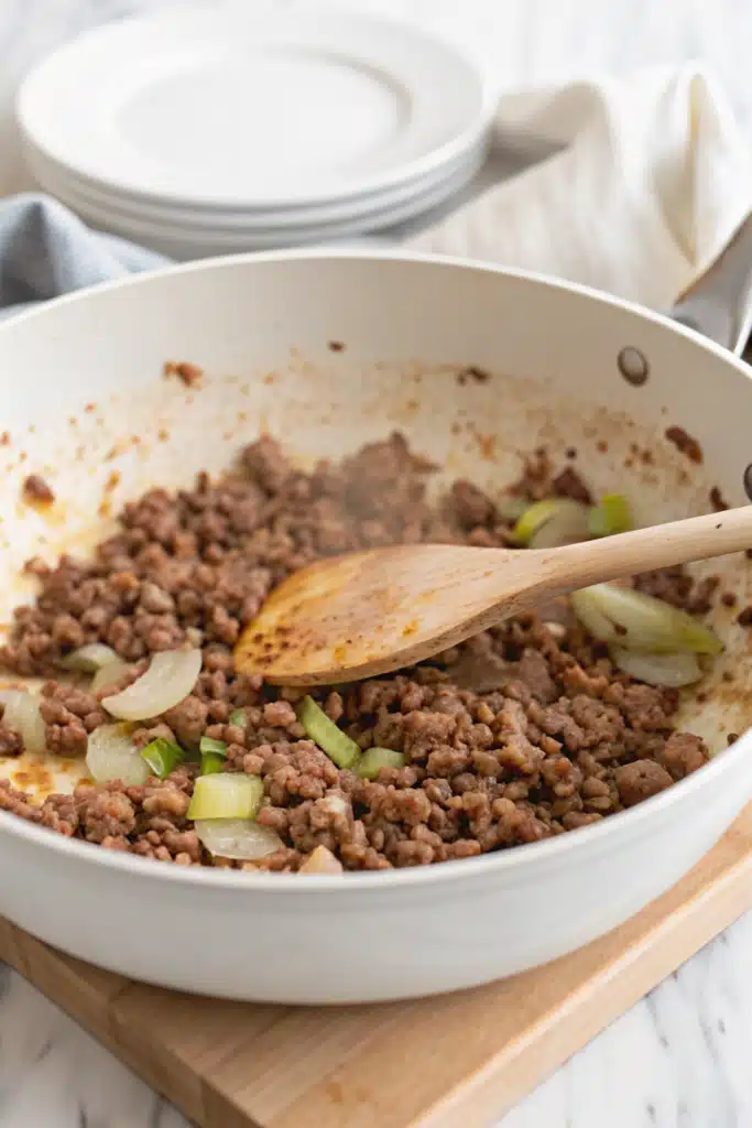Using a sturdy wooden spoon or a handheld meat chopper, break the ground beef into small, bite-sized crumbles. Keep stirring and cooking for about 7 to 10 minutes. You will know it is done when the beef is fully browned and tender, and those diced onions are beautifully translucent.