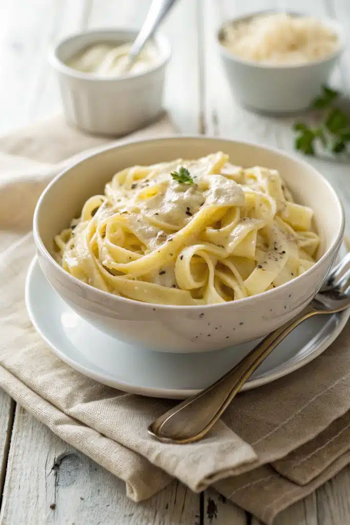 If you’re wondering how this differs from the classic Italian version, let me break it down for you. Traditional Roman Alfredo is actually an incredibly simple emulsion made from just two ingredients: high-quality butter and finely grated Parmigiano-Reggiano cheese, tossed vigorously with hot pasta water. It is absolutely beautiful, but it can be notoriously tricky to master. If the temperature is even slightly off, or if you don’t toss it fast enough, the cheese clumps up and the sauce breaks into a greasy mess.