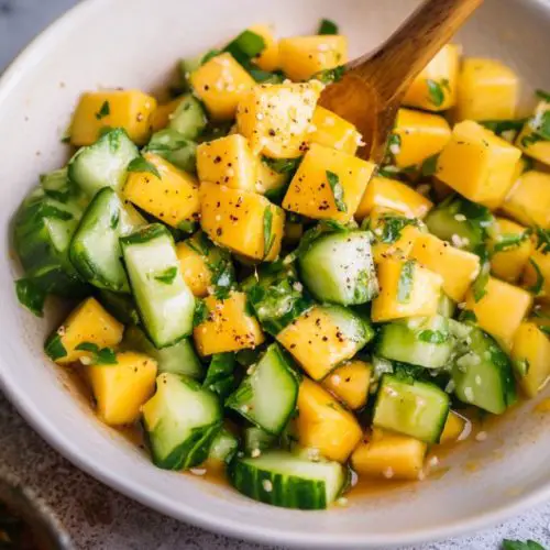 So there you have it – my absolute favorite mango cucumber salad! It’s honestly one of those recipes that just makes my heart sing every time I make it. It’s proof that you don’t need complicated steps or fancy ingredients to create something truly spectacular. It’s the vibrant colors, the incredible freshness, and that perfect sweet-and-tangy balance that make it a winner in my book, and I really hope it becomes a favorite in your kitchen too. If you try this mango cucumber salad, please, please let me know what you think! Drop a comment below, share your own variations, or even tag me on social media. I absolutely love seeing your creations! And if you enjoyed this burst of sunshine, you might also love my Spicy Pineapple Salsa or my Watermelon Feta Salad – they’re in a similar vein of fresh, flavorful goodness. Happy cooking, and I can’t wait to hear how your mango cucumber salad turns out!