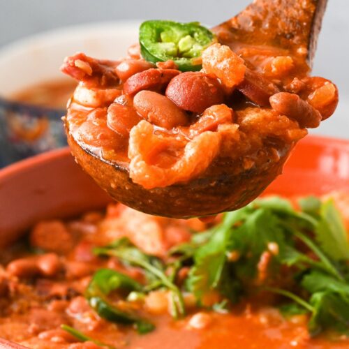 If you are using chicharrón, stir it in now and let it cook for just one more minute. Give your broth a taste and add salt if needed. Ladle into bowls, top with fresh cilantro, crumbled queso fresco, and extra jalapeños, and serve piping hot!