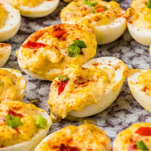 Because these contain mayonnaise and eggs, you definitely want to keep them chilled. Deviled eggs are always best eaten the day they are made, but you can easily store any leftovers in the refrigerator for up to two days. Place them in a single layer in an airtight container so they don’t get squished. When you are ready for a snack, just grab them straight from the fridge—they are meant to be enjoyed cold!