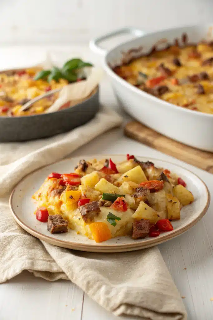 Because this Potato Breakfast Casserole is so rich and hearty, I love to pair it with sides that bring a little brightness and acidity to the table. A big, colorful fresh fruit salad is always a massive hit, especially with kids. If you are serving this for a brunch or lunch, a simple arugula salad tossed in a light lemon vinaigrette cuts through the richness of the cheese and sausage perfectly.
