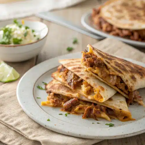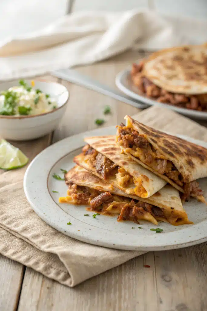 But when we throw pulled pork into the mix? We’re taking things straight to flavor town, blending classic Tex-Mex comfort with Southern BBQ soul. The shredded pork—usually slow-cooked and tossed in a tangy, sweet barbecue sauce—provides a hearty, savory bite that cuts right through the richness of the melted cheese. Throw in some caramelized onions or a handful of sharp cheddar and Monterey Jack, and you’ve got a handheld meal that hits every single craving. It’s essentially the ultimate fusion food. You get the crunch of the toasted flour tortilla, the epic cheese pull we all secretly live for, and the smoky, saucy goodness of BBQ pork. It’s messy, it’s comforting, and it’s unapologetically delicious.