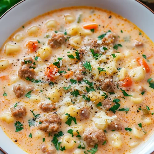 Once the potatoes are tender, add the cooked and crumbled sausage back into the pot. Stir to combine. Now for the magic! Pour in the heavy cream or half-and-half. Stir it in gently until the soup is wonderfully creamy and lusciously smooth. Let the soup simmer for another 5 minutes, uncovered, to allow the flavors to meld and the soup to thicken slightly. Don’t let it boil rapidly after adding the cream, or it could curdle.