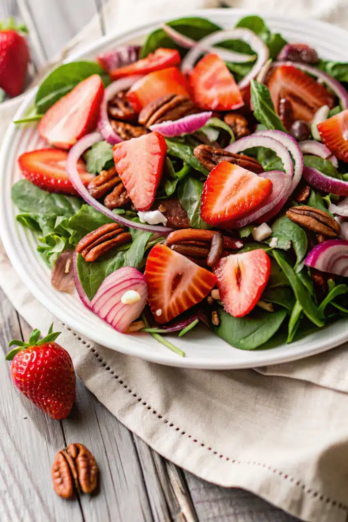 But a salad is only as good as its supporting cast, right? To give it that irresistible crunch, we toss in some toasted pecans. Then, we add thinly sliced red onions for a zesty, savory bite that cuts right through the sweetness of the berries. You can even sprinkle in some creamy crumbled cheese like feta or goat cheese if you are feeling fancy.