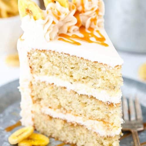 Once the cake has cooled sufficiently (you can serve it warm or at room temperature), slice it into squares. The caramel swirls will make each piece look a little different and extra special. This banana caramel cake is absolutely divine on its own, but it’s also amazing served with a dollop of whipped cream or a scoop of vanilla bean ice cream. The contrast of warm cake and cold ice cream is just heavenly!