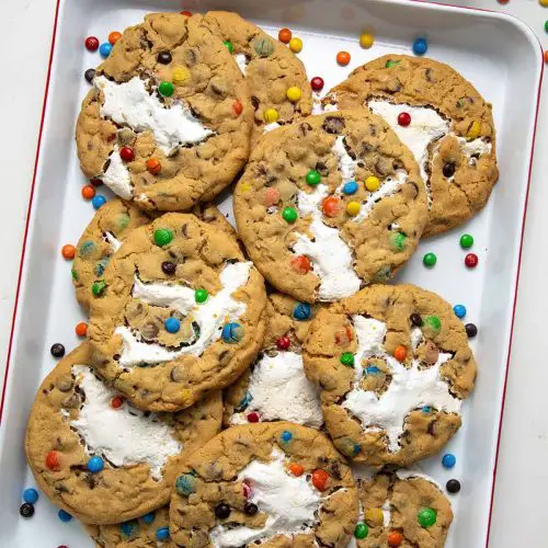 Pop the cookies in the oven and bake for 10-12 minutes. Keep a close eye around the 10-minute mark—once the edges turn golden and cookies still look slightly soft in the center, they’re ready. The marshmallows will be melting and bubbly, so don’t overbake or they’ll burn. Use a toothpick to check don’t worry if the centers are a little soft—these cookies are supposed to be ultra-chewy!