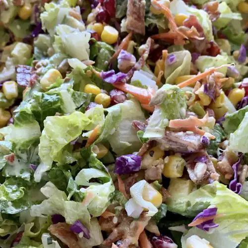 - In a large bowl, combine all the salad ingredients: cooked bacon, chopped romaine lettuce, diced avocado, diced cucumber, pomegranate seeds, warmed corn, shredded red cabbage, shredded carrot, sesame seeds, and sunflower seeds.
