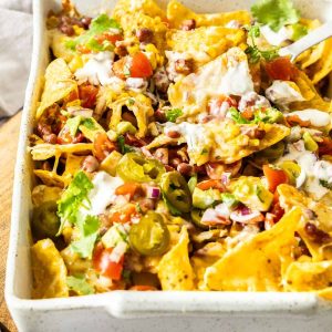 Freezer Instructions: I don’t love freezing nachos because the chips lose their crunch, but if you must, assemble and freeze unbaked, then bake directly from frozen, adding 5–10 minutes. Cheese will firm up, but you’ll have a more crumbled texture. For the glaze, wait to add until after reheating for best texture and flavor.