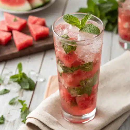 If you want to prep for a party, you can make the watermelon juice base ahead of time. Blend your watermelon, mix it with the fresh lime juice, and store it in an airtight jar or pitcher in the refrigerator for up to three days. You can also make a mint-infused simple syrup if you want to prep the mint flavor in advance without having wilted leaves sitting in your fridge.